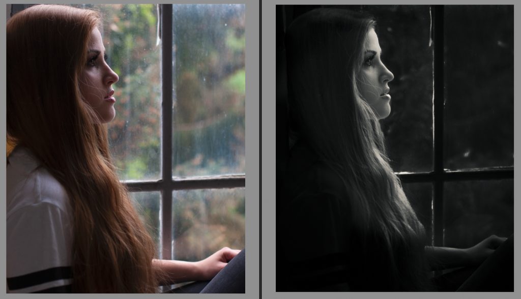 Bei der Bearbeitung habe ich dann ganz gezielt darauf hingearbeitet, wie ich das Foto haben wollte. Es wurde in schwarz weiß umgewandelt, die RGB-Anpassungen wurden gemacht, Helligkeiten wurden bearbeitet, alles Unwichtige wurde abgedunkelt. Das Gesicht etwas geglättet und zum Schluss wurde das Foto leicht geschärft.