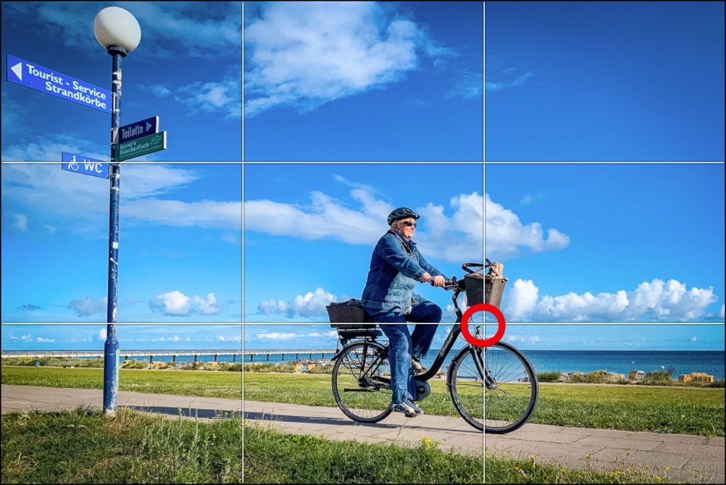 Das hat einen großen Vorteil: Wenn z. B. bei einem Portrait die abgelichtete Person in eine Richtung aus dem Bild herausschaut (also nicht direkt auf den Fotografen), dann braucht der Blick genügend „Platz“ auf dem Foto. Dadurch, dass man nun das Hauptmotiv (die Person) auf der gedachten Drittel-Linie hin- und herschieben kann, wird diese Notwendigkeit nicht auf Kosten der Harmonie geopfert.